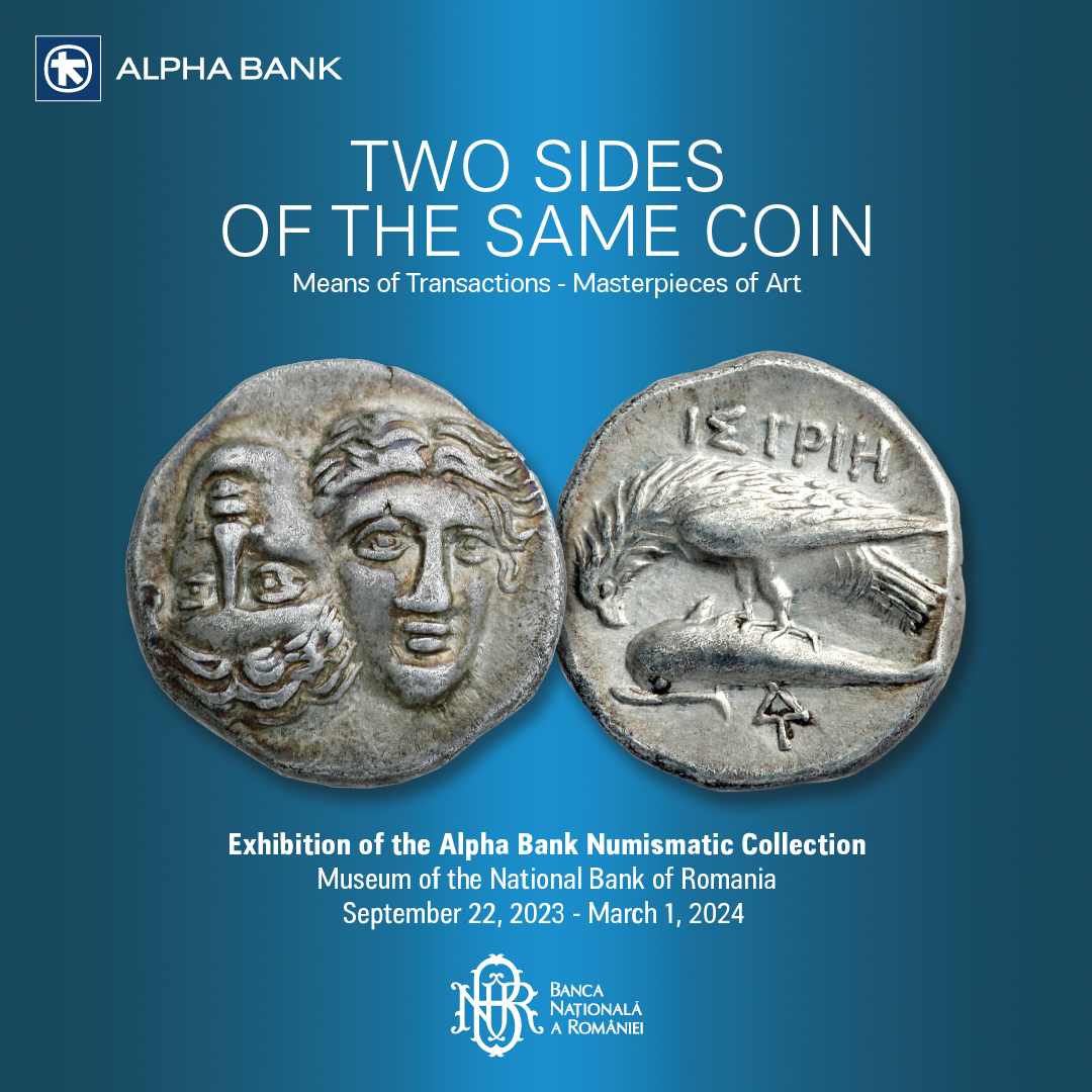 Η έκθεση «Two Sides of the Same Coin. Means of Transactions – Masterpieces of Art» (Οι 2 Όψεις του Νομίσματος. Μέσο Συναλλαγής και Έργο Τέχνης) φιλοξενείται στη Ρουμανία. Παρουσιάζει 100 ελληνικά νομίσματα της Νομισματικής Συλλογής της Alpha Bank, που αφηγούνται την εμφάνιση και εξέλιξη του νομίσματος, και απεικονίζουν μυθικά ή ιστορικά πρόσωπα και παραστάσεις. Ορισμένα από αυτά είναι σπάνια αριστουργήματα της αρχαίας ελληνικής νομισματοκοπίας.