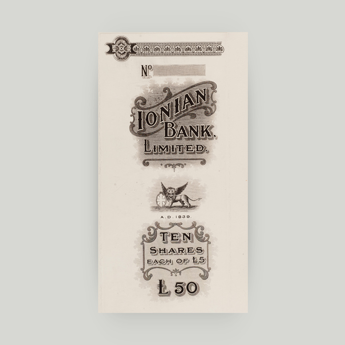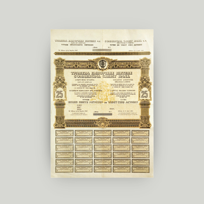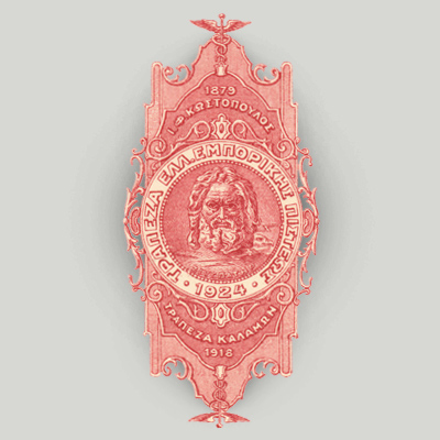 Το λογότυπο της Τράπεζας Ι.Φ. Κωστοπούλου είναι λεπτομέρεια από φύλλο επιταγής.
