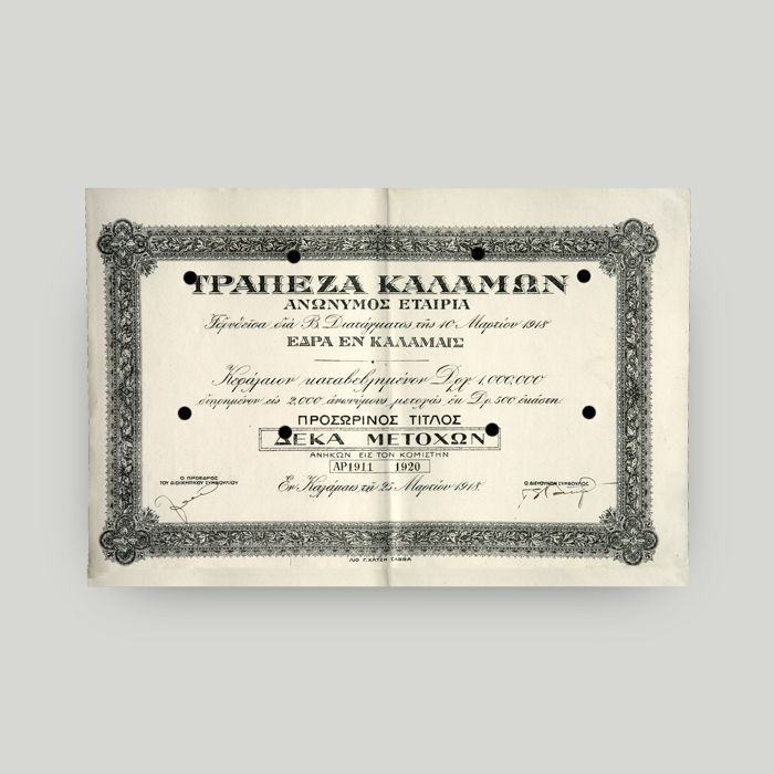 Το καταστατικό της νέας τράπεζας υπογράφτηκε στις 4 Μαρτίου 1918. Η νέα επωνυμία ήταν «Τράπεζα Καλαμών».