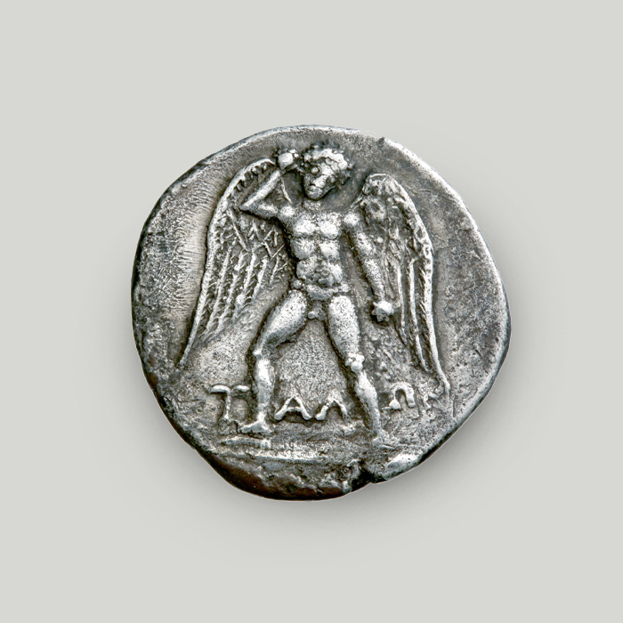 Στεφανωμένη κεφαλή του θεού Απόλλωνα σε δεξί προφίλ.