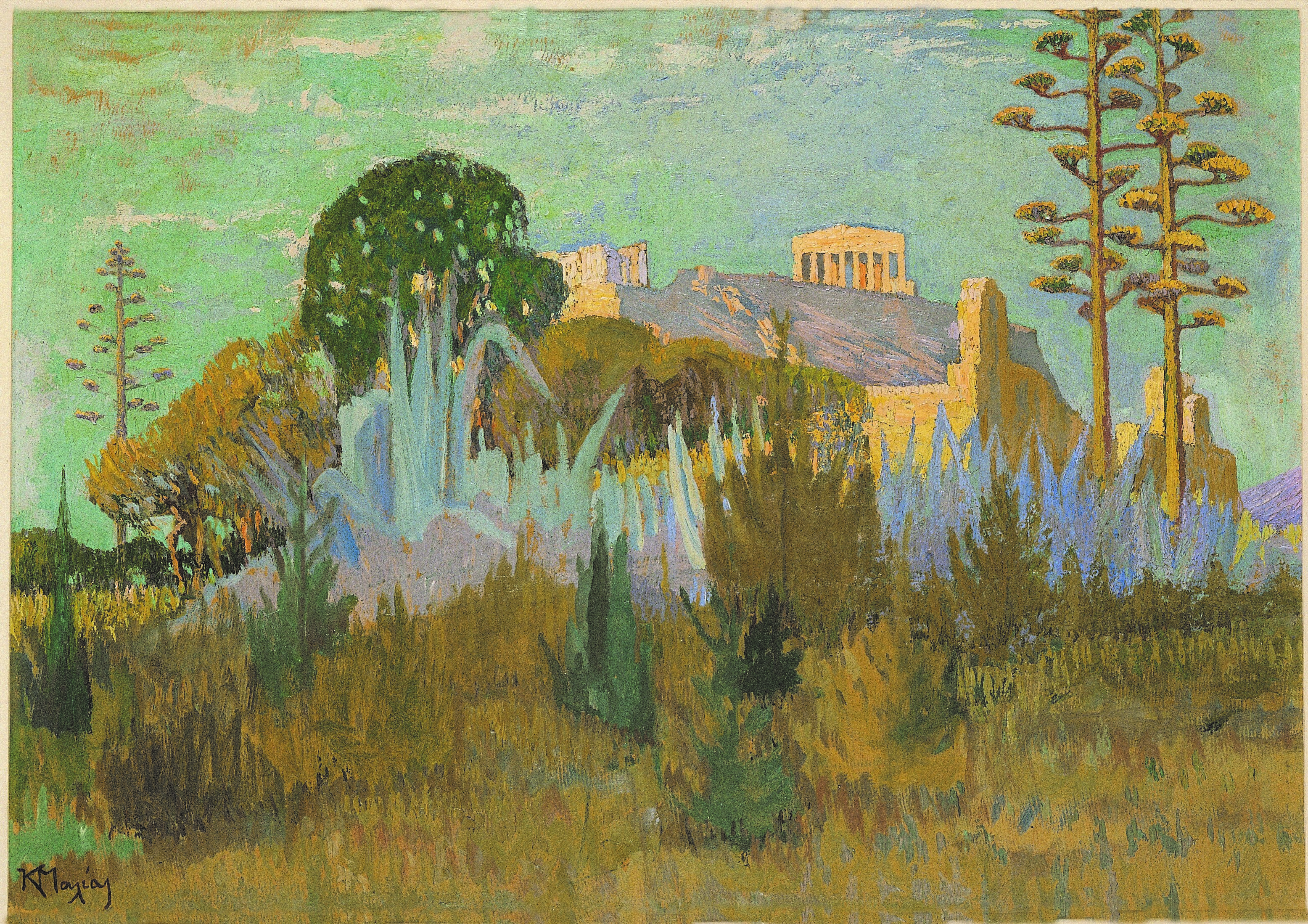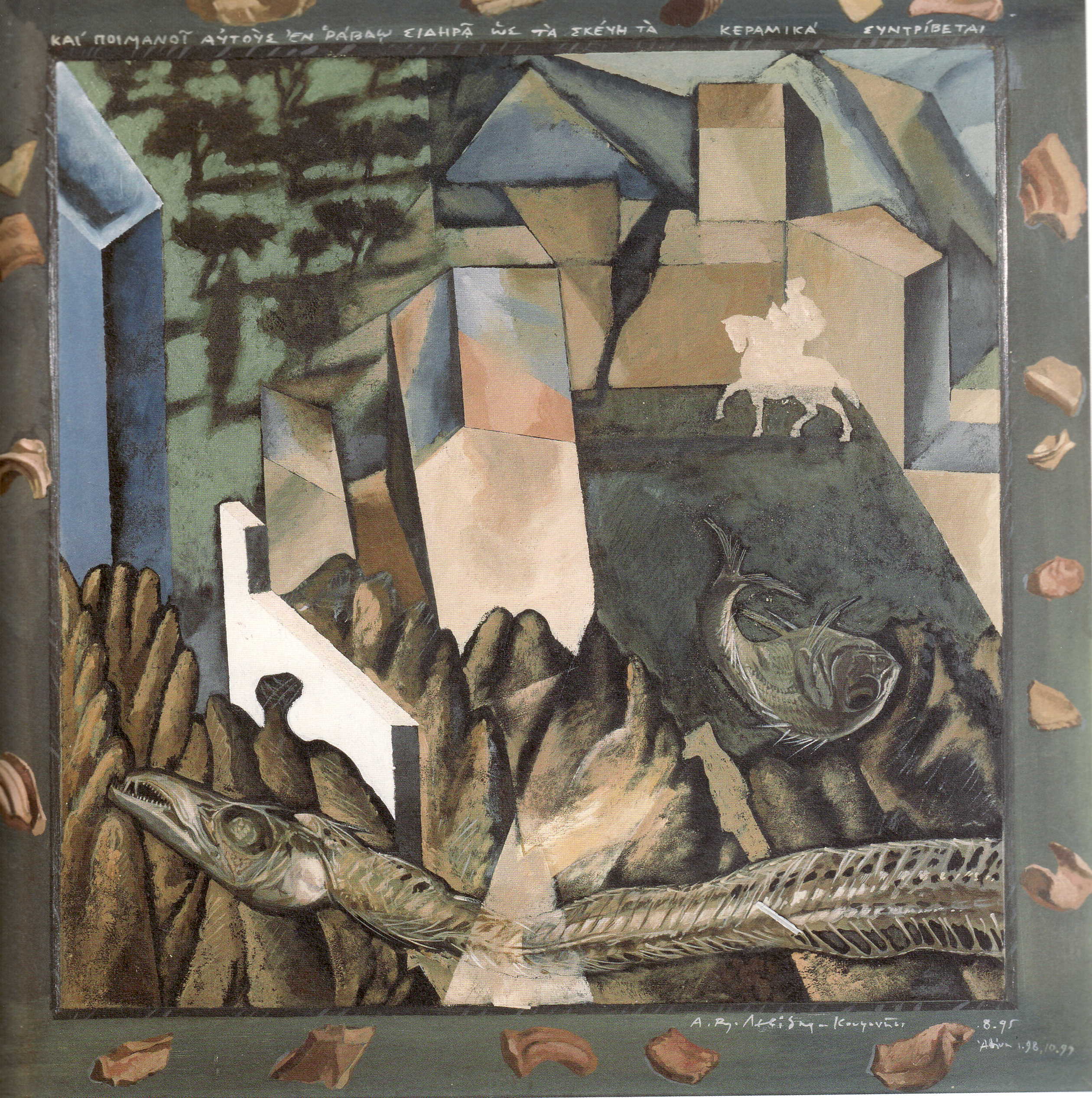 The paintings of important artists, such as Matisse and Theophilos, together with folk traditions and the Karaghiozis puppets inspired him to create his unique personal style; his work striking a balance between the East and the West.
