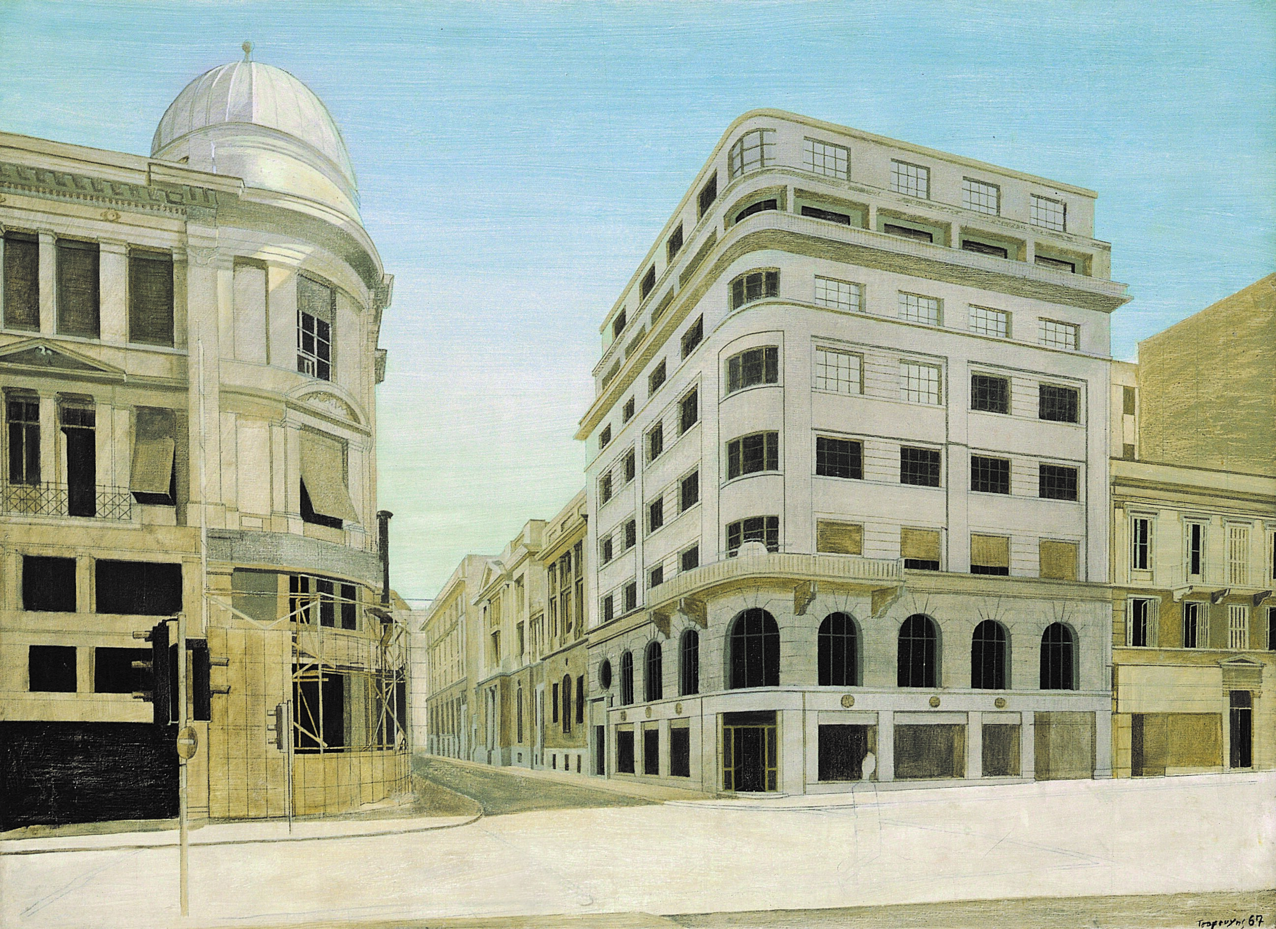 The painting 23rd March Square in Kalamata by Yannis Tsarouchis depicts the building of the first branch of Alpha Bank in Kalamata, with the then name “COMMERCIAL CREDIT BANK” on its façade. The branch still stands today in the central square of Kalamata, 23rd March Square.